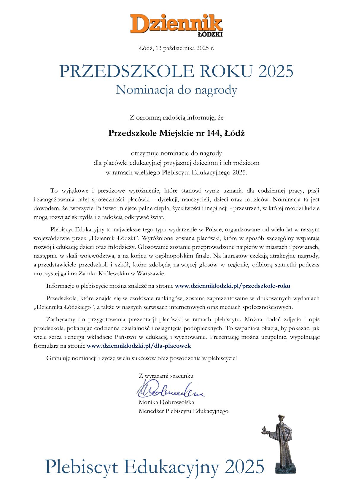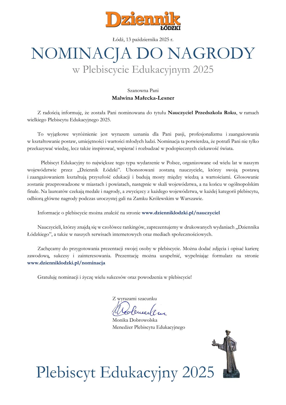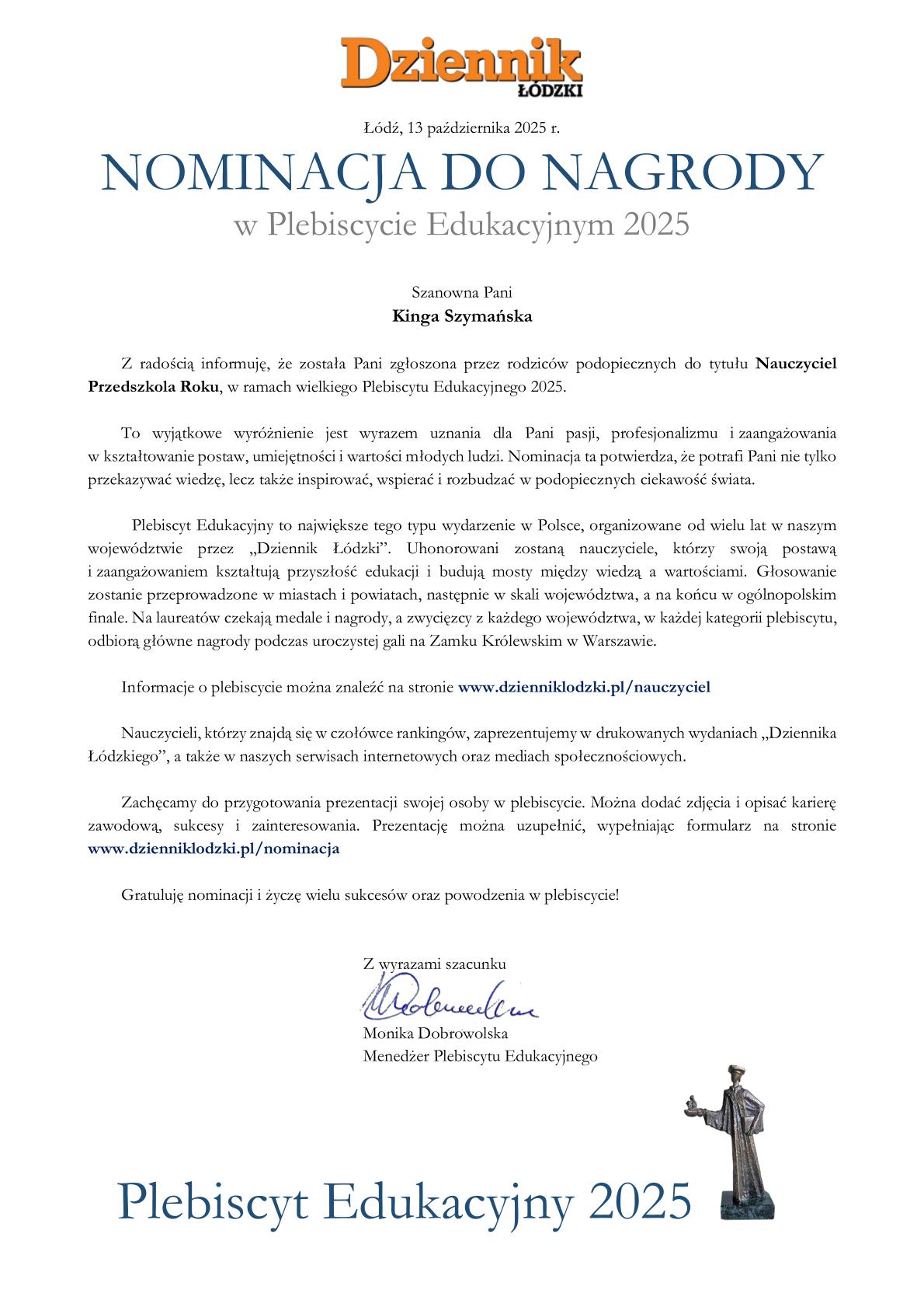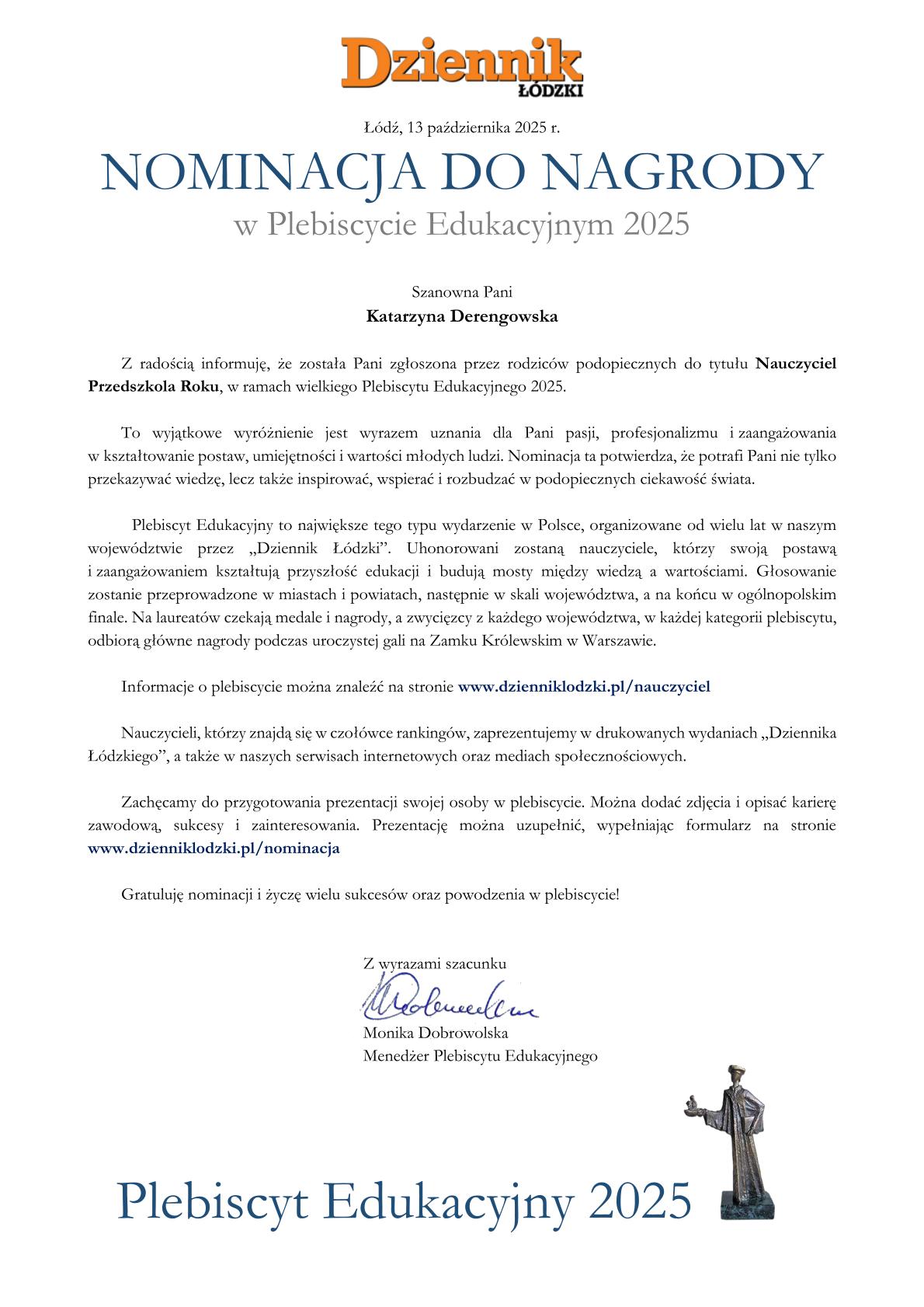 Z radością informujemy, że nasza placówka została zgłoszona do nagrody w kategorii Przedszkole Roku w tegorocznej edycji Plebiscytu Edukacyjnego 2025! Ponadto nasze nauczycielki otrzymały nominacje do nagrody w kategorii Nauczyciel Przedszkola:
