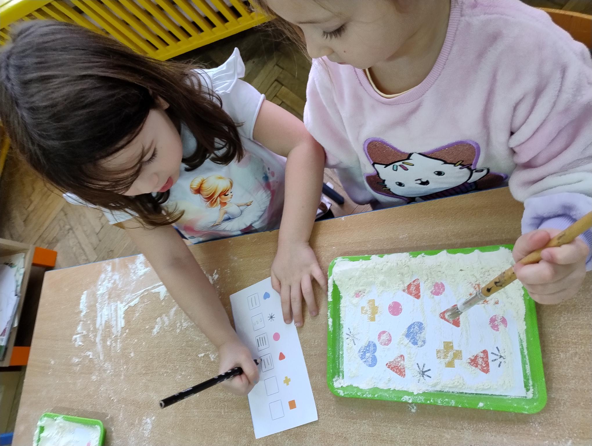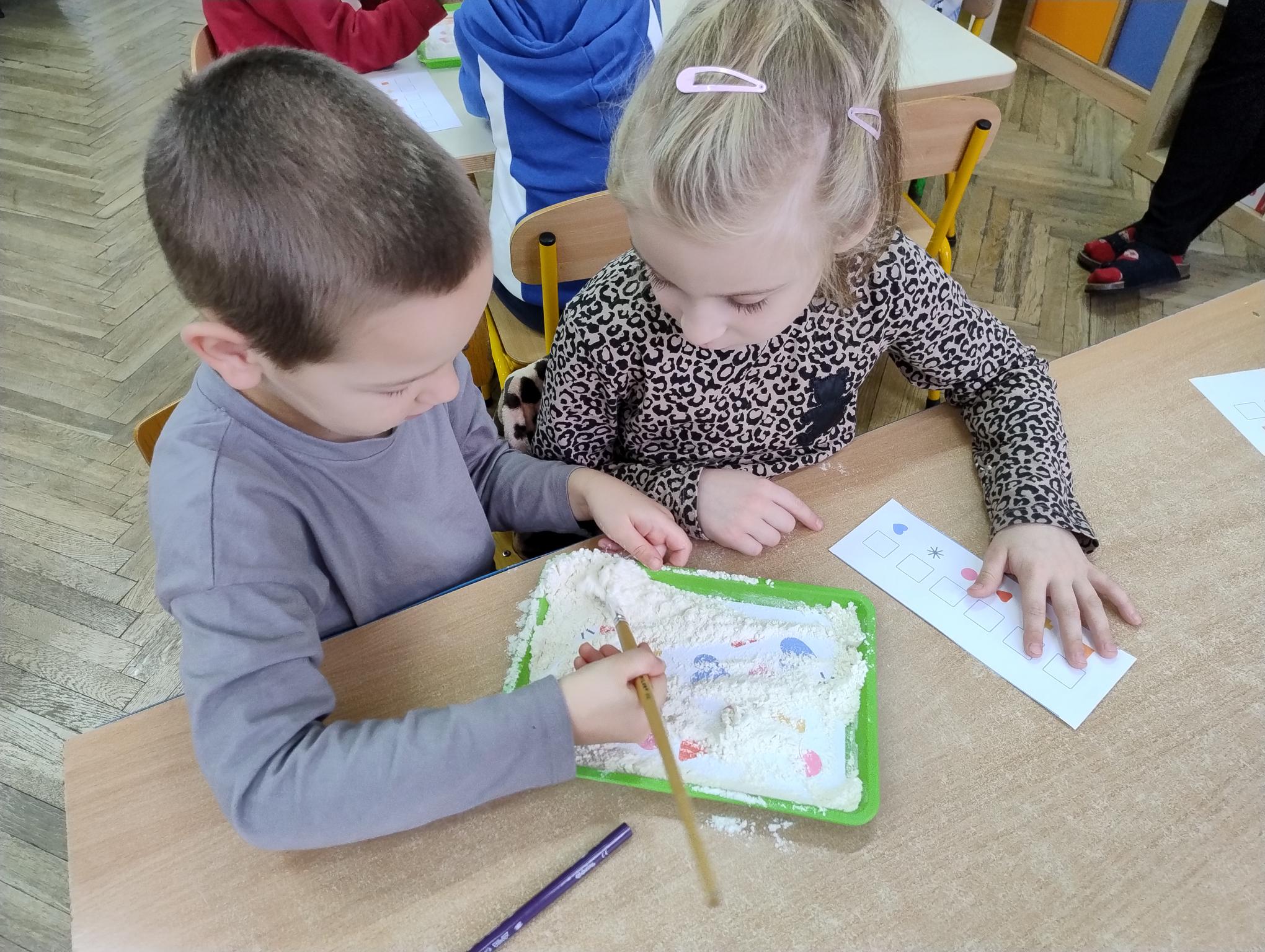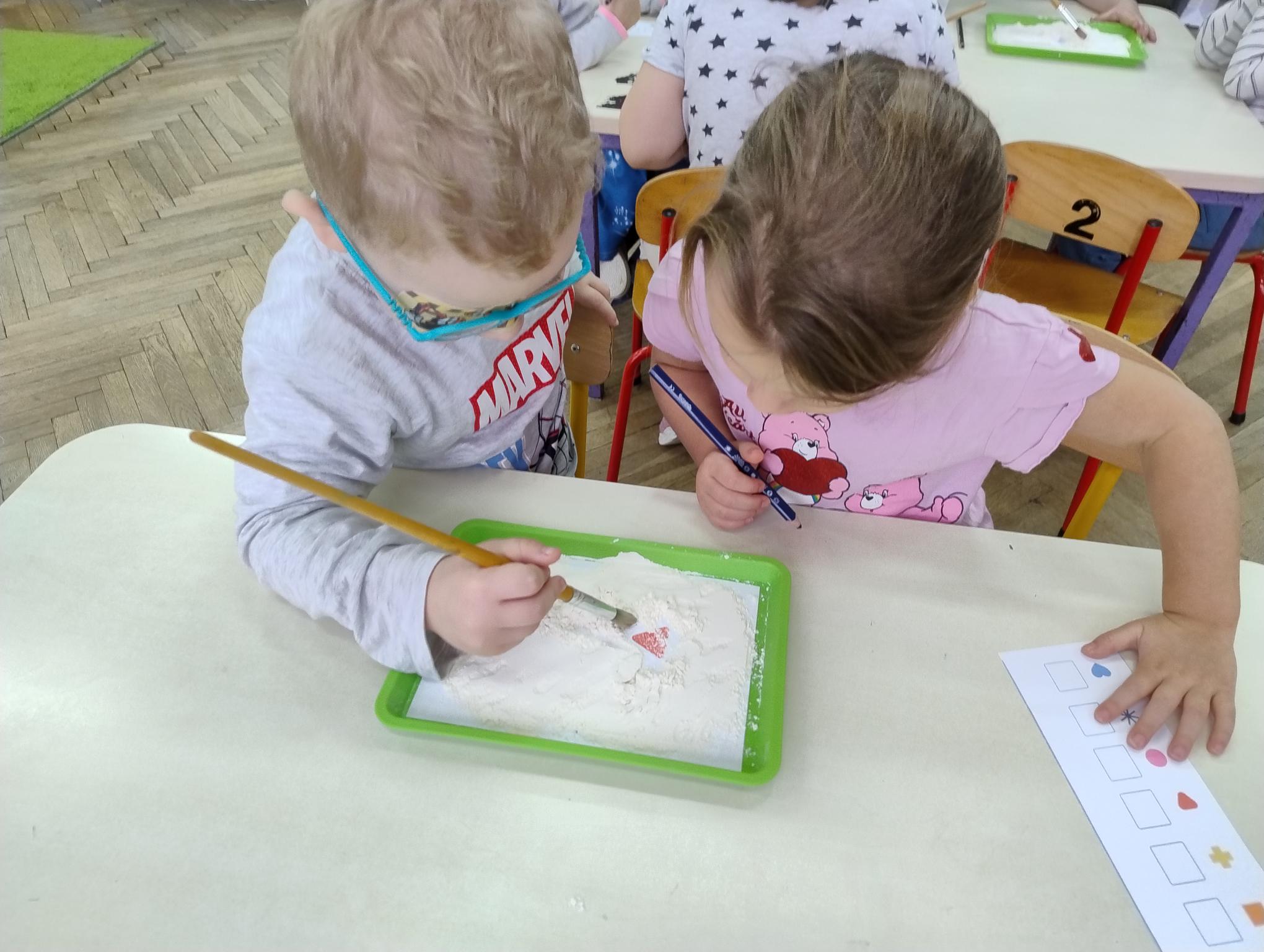 Dzieci w miesiącu grudniu zrealizowały moduł III - "Sensoryczna matematyka". W parach za pomocą pędzelków wyszukiwały w mące różne elementy, przeliczały je i odnotowywały na osobnych kartkach. Wyklejały również plasteliną cyfrę 5.