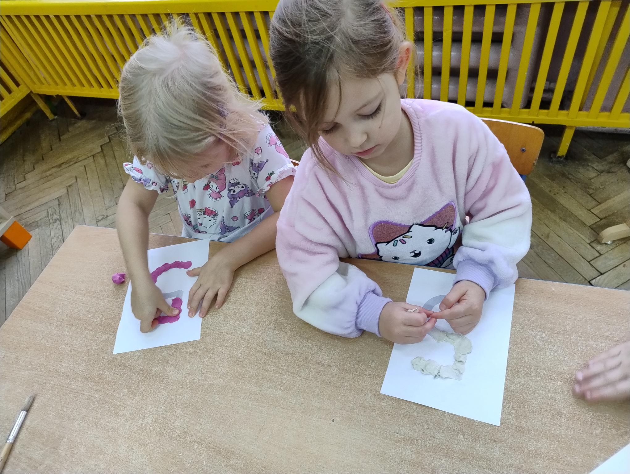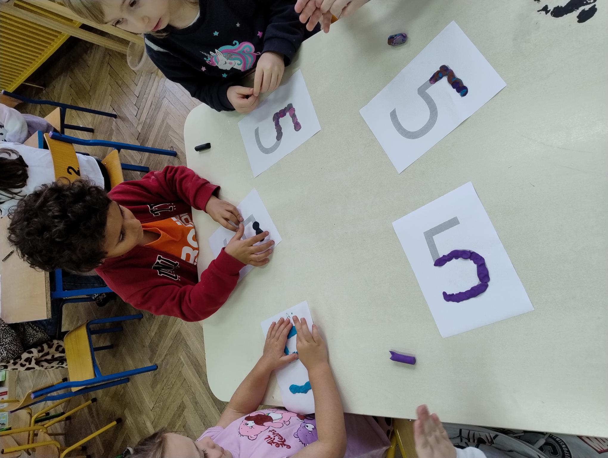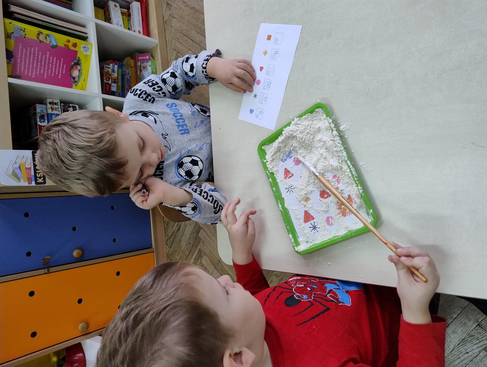 Dzieci w miesiącu grudniu zrealizowały moduł III - "Sensoryczna matematyka". W parach za pomocą pędzelków wyszukiwały w mące różne elementy, przeliczały je i odnotowywały na osobnych kartkach. Wyklejały również plasteliną cyfrę 5.