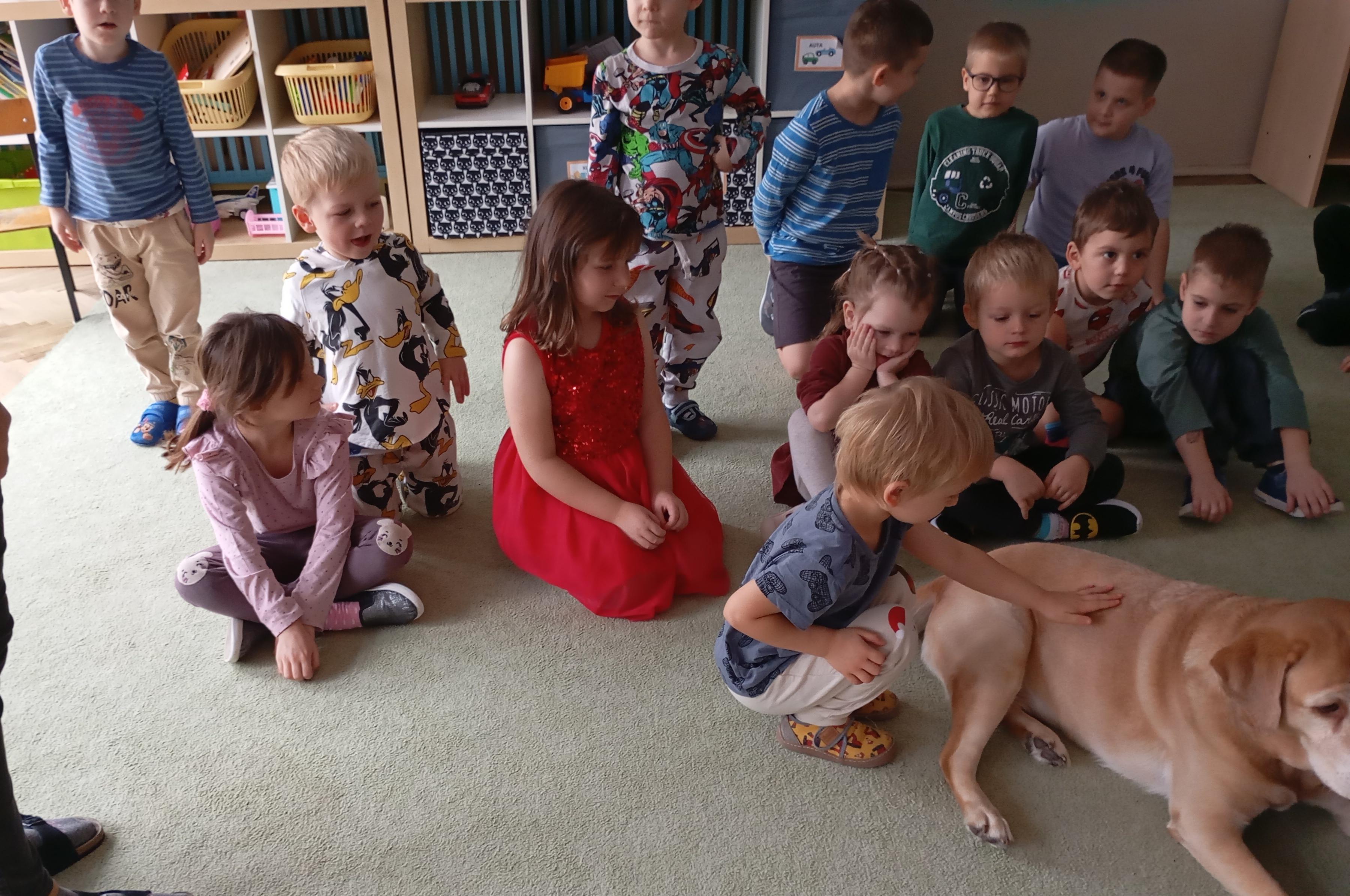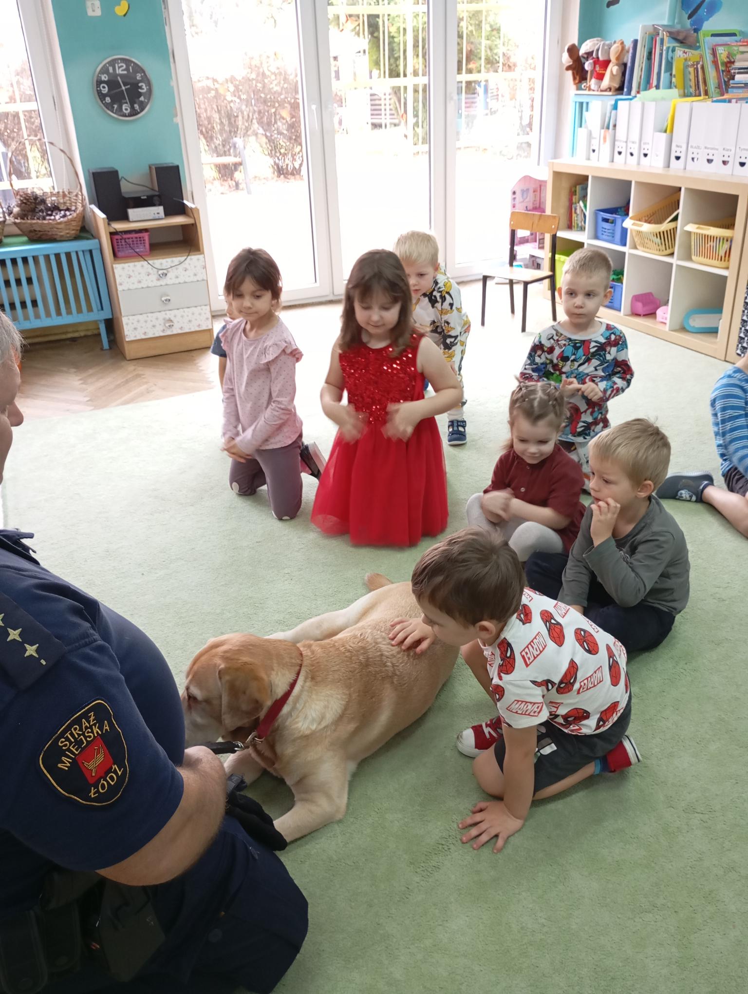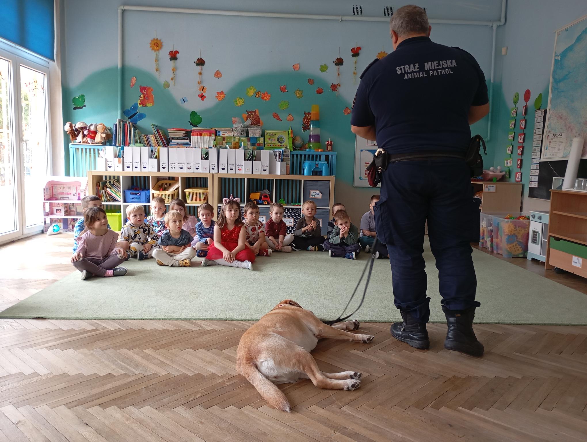 Do naszej grupy zawitał również Strażnik Miejski wraz ze swoim pupilem. Pan poinstruował nas jak powinniśmy się zachowywać w kontaktach z obcymi psami. Na co zwrócić uwagę i czego kategorycznie nie wolno robić. To była bardzo cenna lekcja.