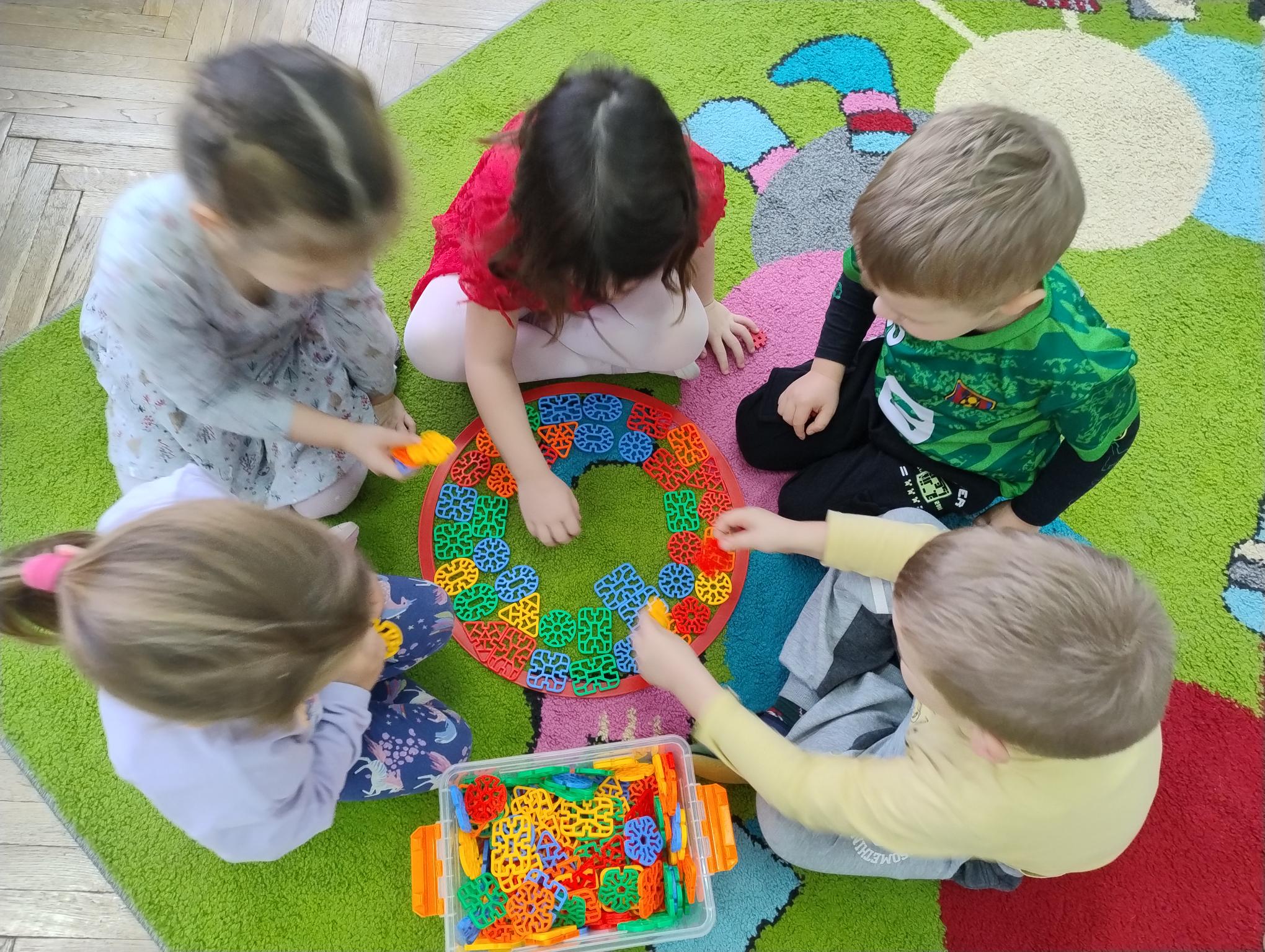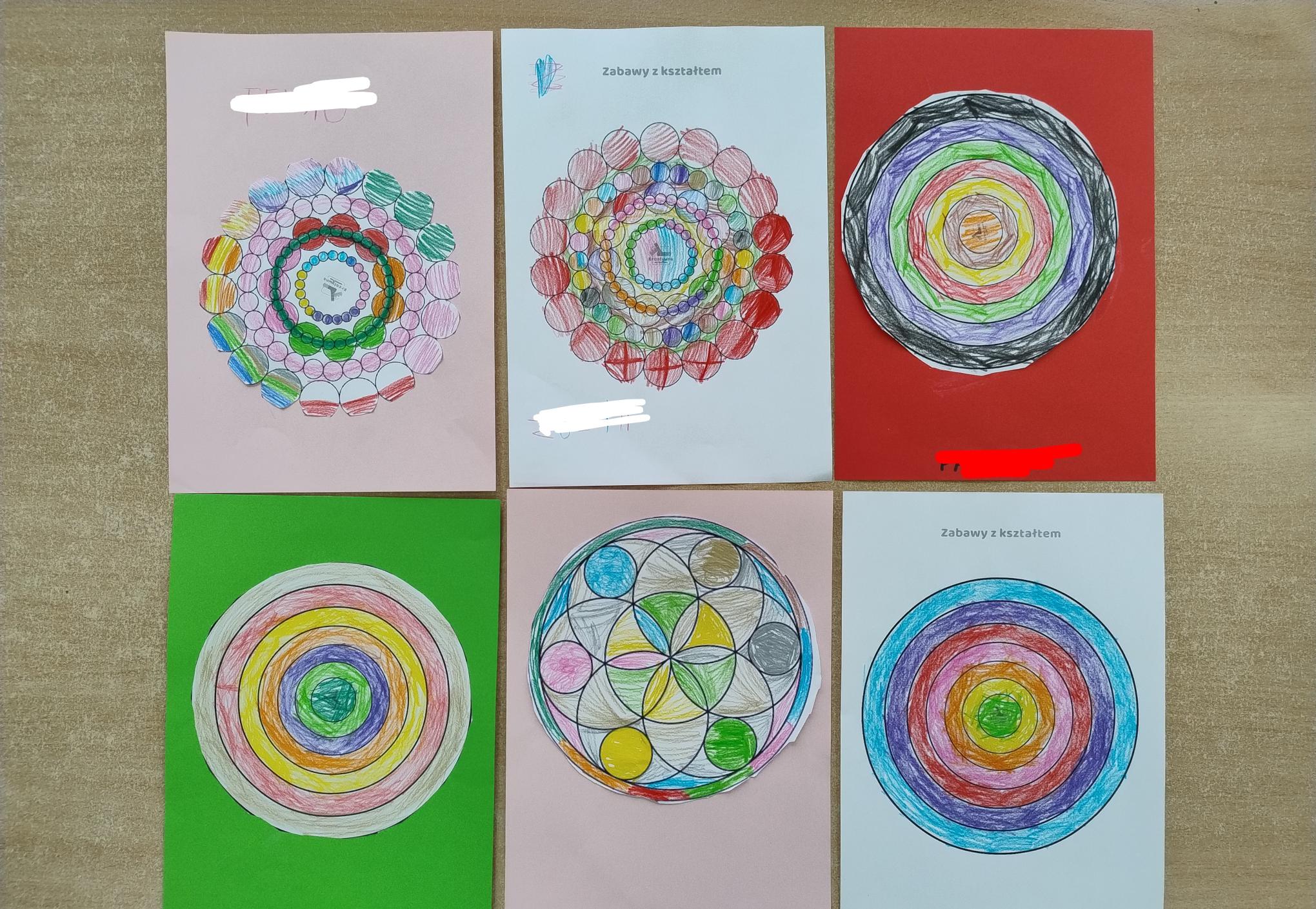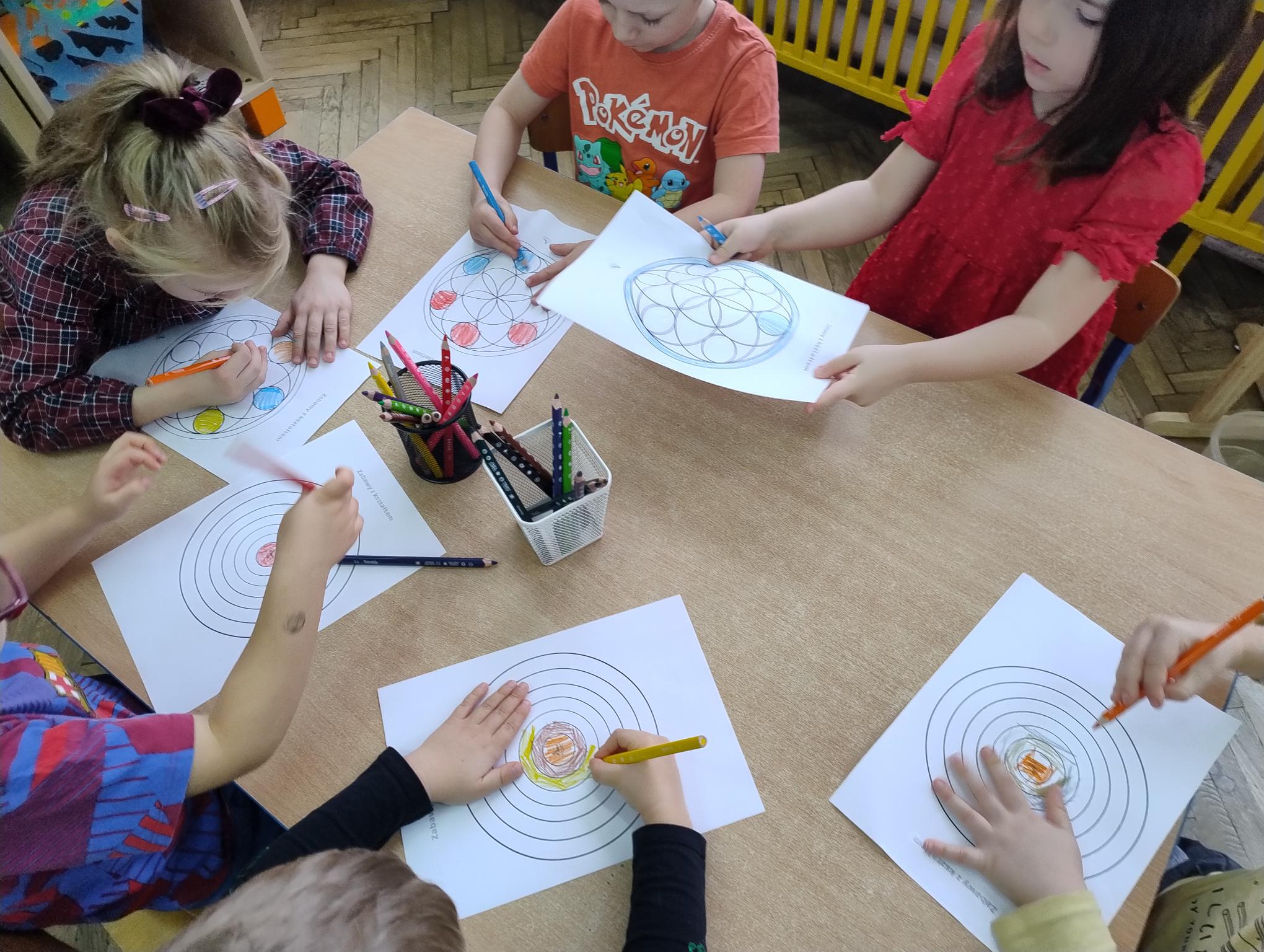 Dzieci w miesiącu listopadzie zrealizowały moduł II - "Zabawy z kształtem". Układały kolorowe mandale w małych grupach z różnych klocków oraz kolorowały własne mandale.