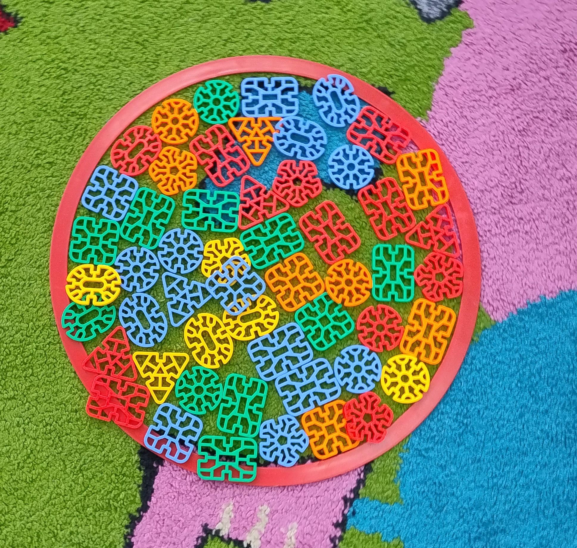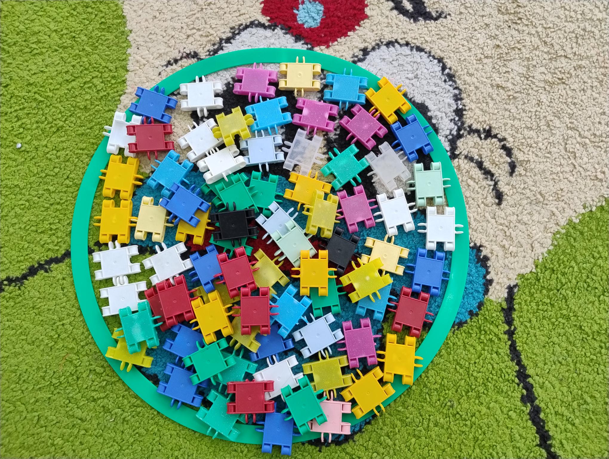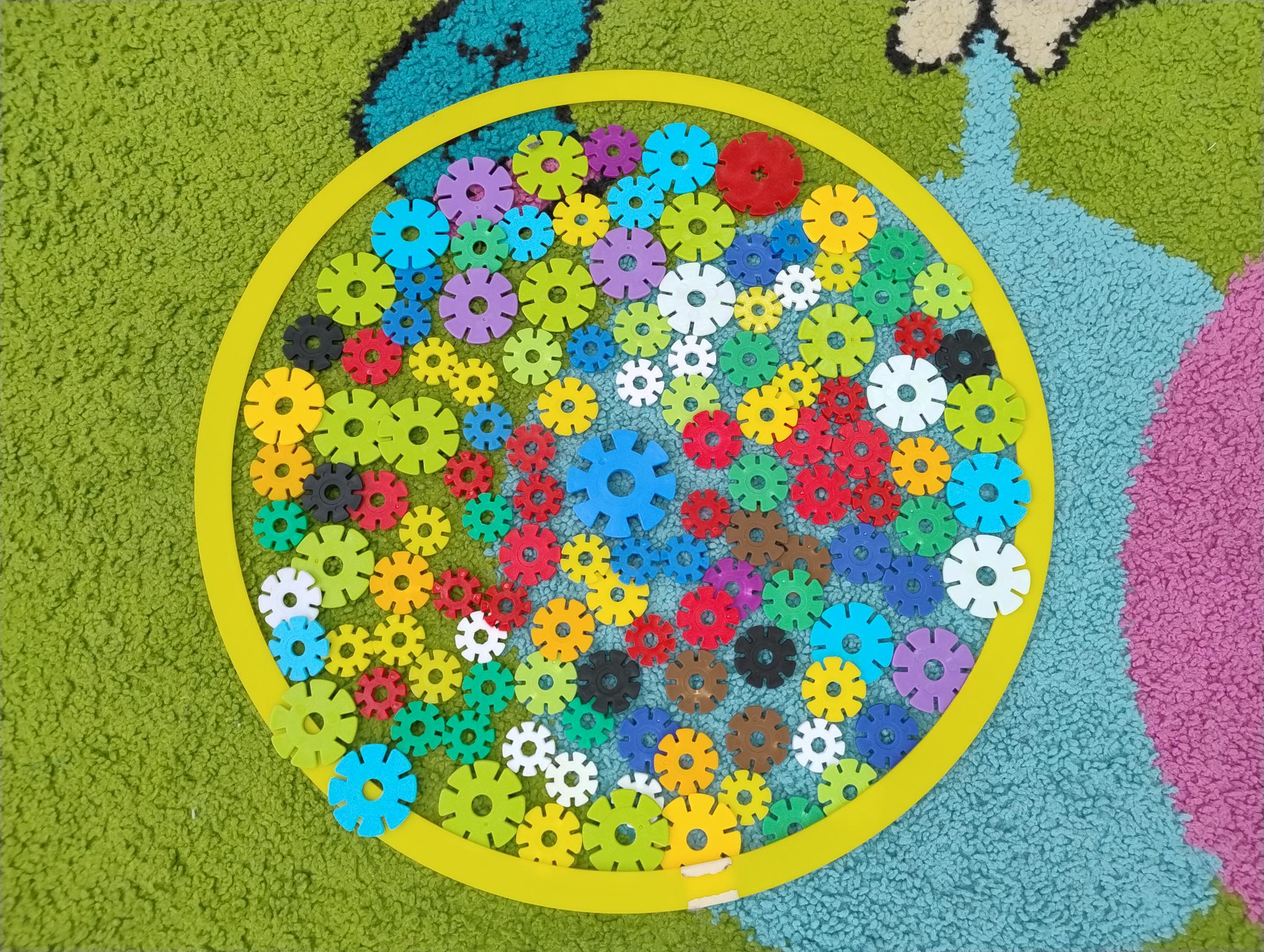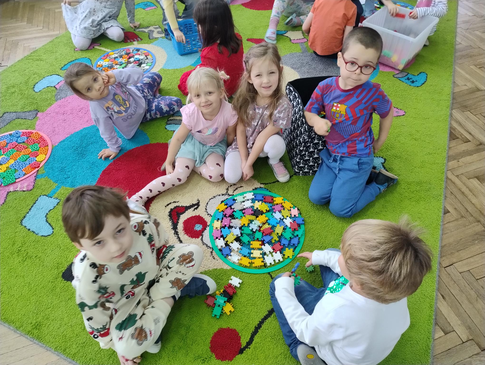 Dzieci w miesiącu listopadzie zrealizowały moduł II - "Zabawy z kształtem". Układały kolorowe mandale w małych grupach z różnych klocków oraz kolorowały własne mandale.